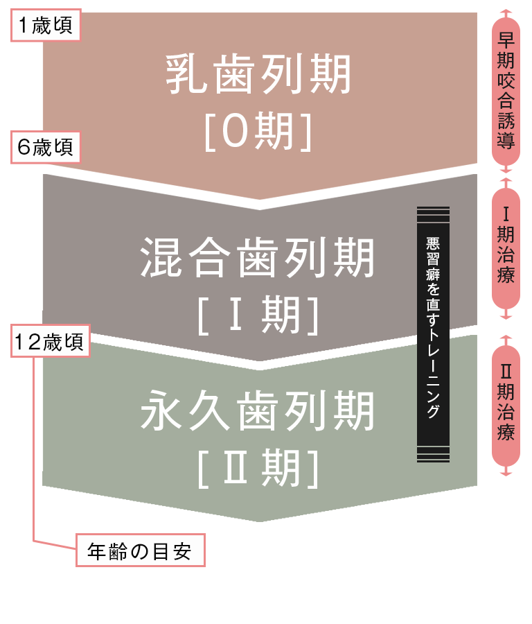 矯正治療には、まだ永久歯が生え揃っていない時期の「第一期治療」(8~10歳)と、全ての永久歯が生え揃った時期の「第二期治療」があります。治療を始める時期はお口の中の状態で変わってきますが、受け口(下のアゴが前に出ている状態)の治療ですと、3歳から治療を始めることも可能です。その場合、歯の裏側に付ける取り外しのできる装置を使用して治療を行います。